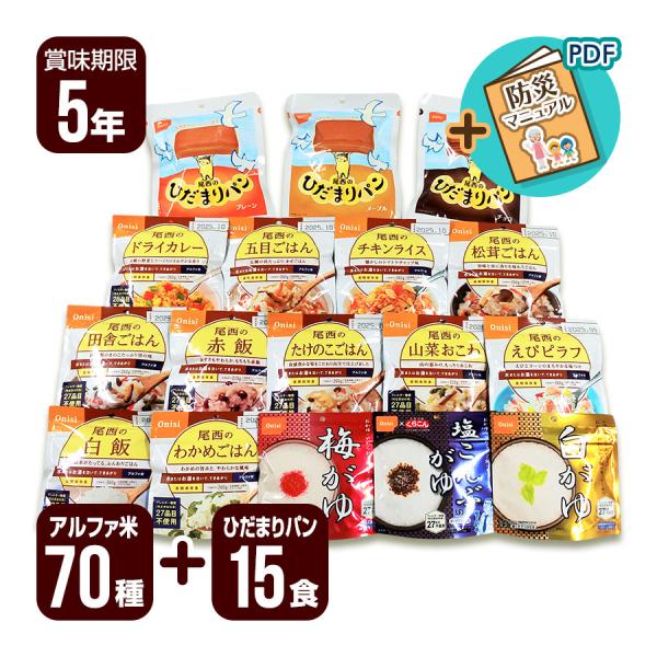 アルファ米 70食セット[14種類×各5袋]+ひだまりパン15食セット[3種類×各5個] 尾西食品 非常食セット 防災食 保存食 防災セット 5年保存 送料無料