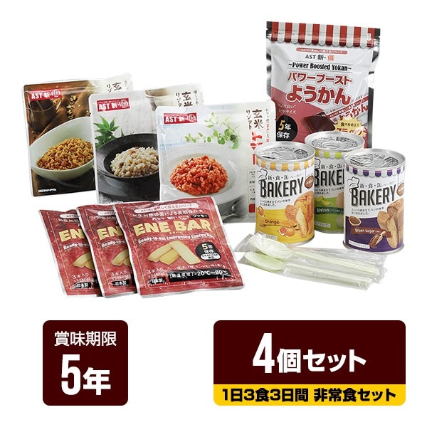 新・備 1日3食3日間 非常食セット 4個セット アスト 5年保存 パン 缶詰 長期保存 防災食 防災グッズ オフィス 備蓄 送料無料