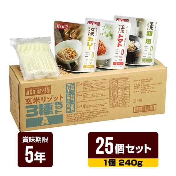 非常食 新・備 玄米リゾット 3種セット 240g×25個セット アスト 5年保存 レトルトパウチ 長期保存 防災食 防災グッズ 送料無料